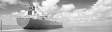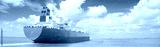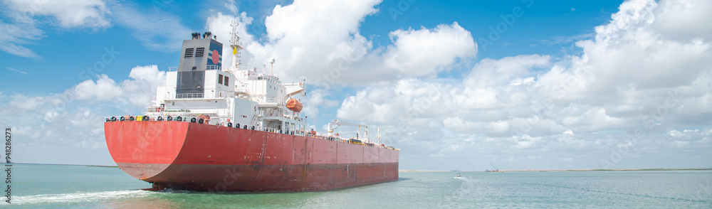 Panorama view crude oil tanker ship under sunny cloud blue sky, bridge deck, crane, VHF radio frequencies antennas satellite radar, bulk transport sail thru South Padre Island, Brownsville port