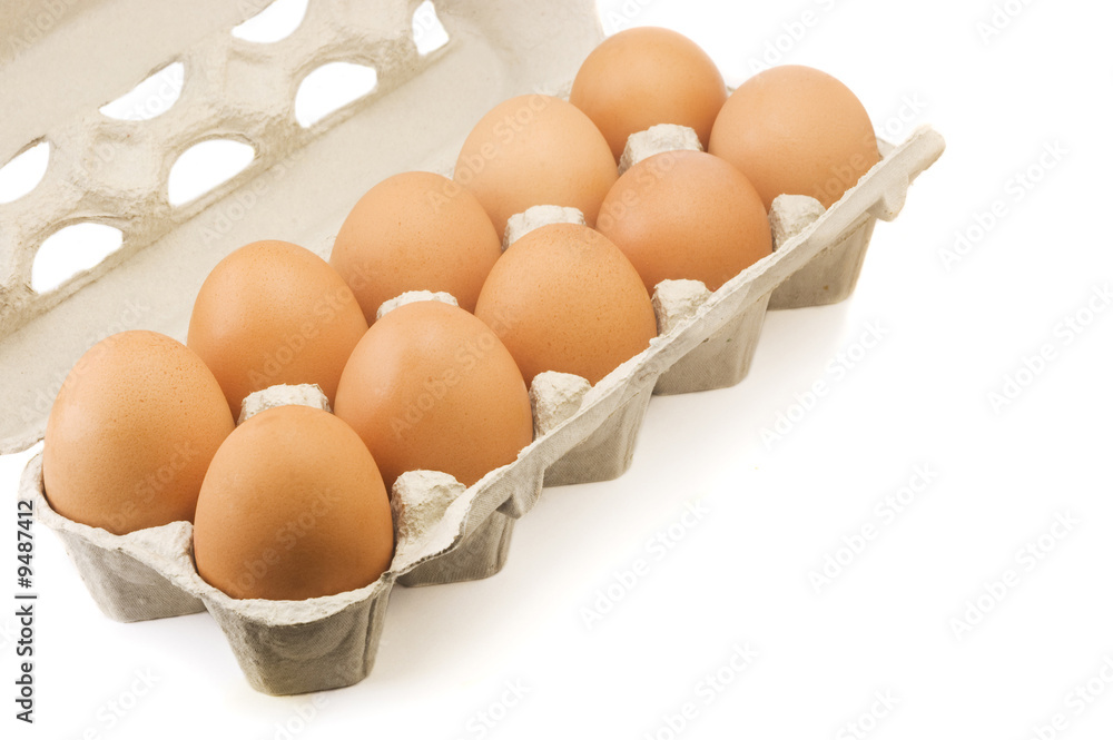 Ten brown eggs in a cardboard carton
