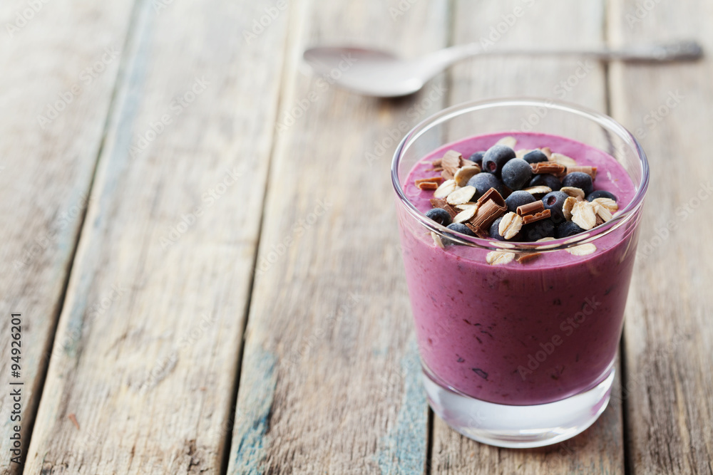 Healthy breakfast of smoothie, dessert, yogurt or milkshake with frozen berry and oats decorated grated chocolate on wooden vintage table