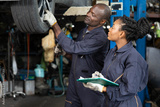 African mechanic workers fixing and checking a car or tire in automobile repair shop