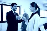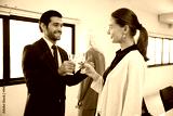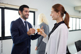 businessman with businesswoman drinking beer and clinking glasses in the office