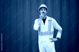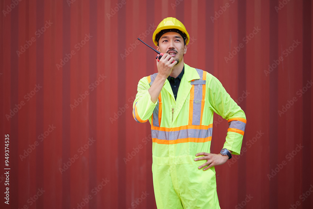 worker or engineer using walkie talkie and talking about work in containers warehouse storage