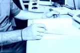 Doctor in a robe sitting at a table in a hospital office