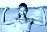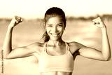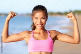 Happy sporty fitness woman flexing muscles on beach. Smiling young is wearing pink sports bra. Female is showing her strength and healthy lifestyle on sunny day.