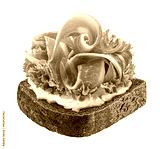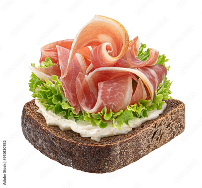 Rye bread with smoked bacon or pork brisket slices isolated on white background