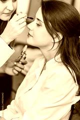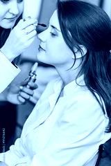 beautiful girl doctor in a white coat makes make-up