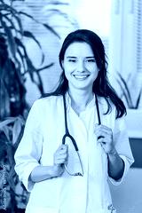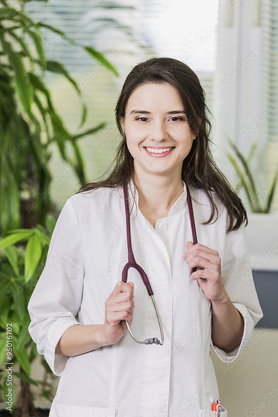 beautiful girl Doctor in a white coat standing in hospital smiling