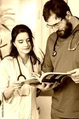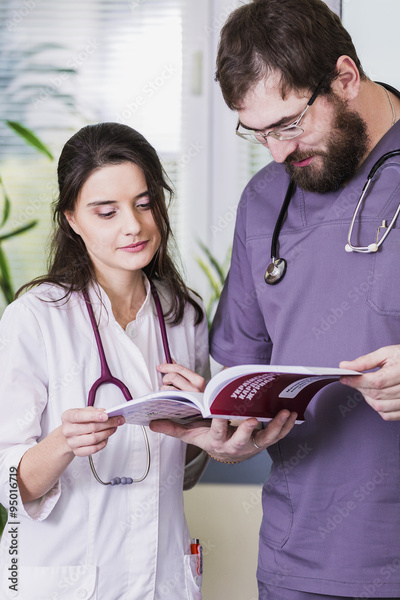 girl Doctor in a white coat with a stethoscope and male doctor with book