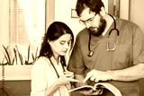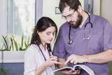 girl Doctor in a white coat with a stethoscope and male doctor with book