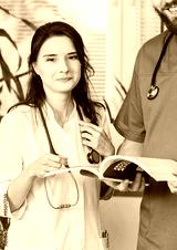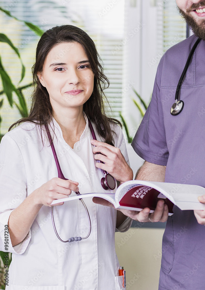 girl Doctor in a white coat with a stethoscope and male doctor with book