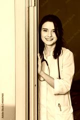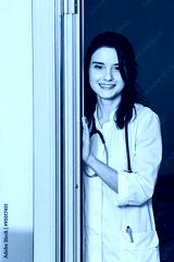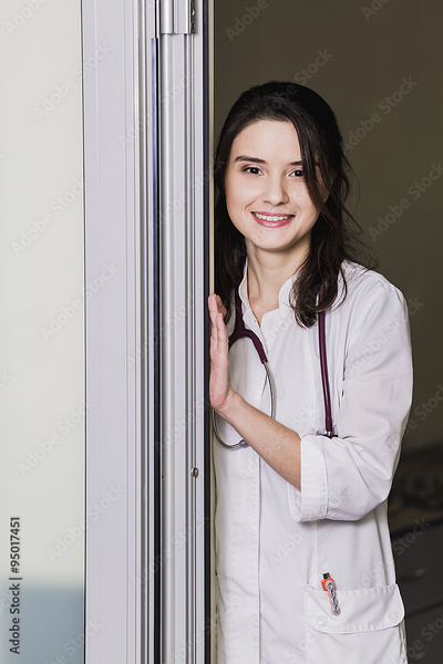 beautiful girl Doctor in a white coat standing in hospital smiling