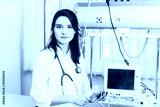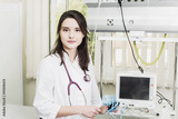 girl Doctor in a white coat adjusts clinical equipment and monitor