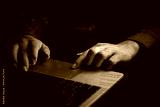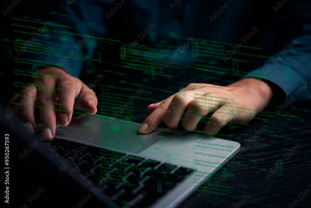 A close-up of hands typing on a laptop keyboard with digital code overlay, representing software development, cybersecurity, or hacking activities. Technology, IT development, cybersecurity.