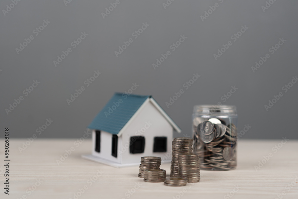 house model beside stacks of coins and a jar filled with money savings, real estate investment, and financial planning for property ownership.