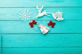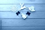 Christmas accessories on blue wooden background. Top view