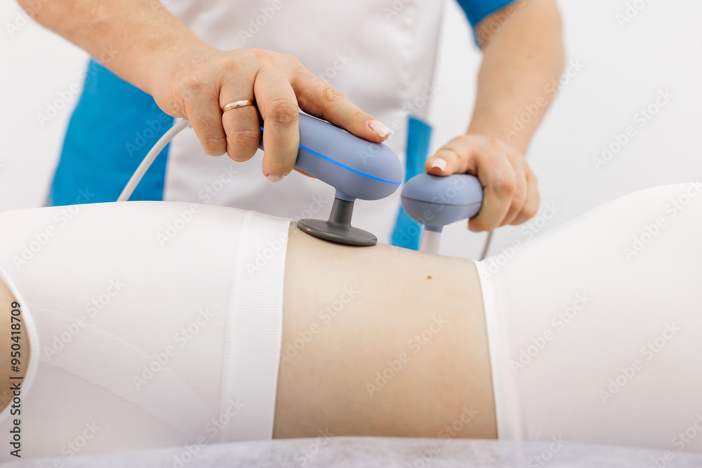 A professional physiotherapist administers electromagnetic therapy to a young woman in a state-of-the-art clinic. This advanced treatment aids tissue repair, alleviates pain, and boosts muscle recover