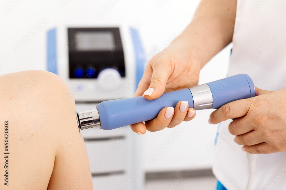 Effective Shockwave Therapy for full-body wellness. A young woman receiving treatment for pain relief and muscle recovery. Enhances overall health and promotes healing.