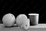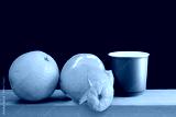 Orange fruit and a blue cup of coffee on a wooden shelf. Black background.