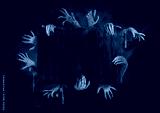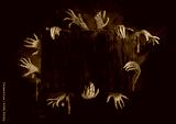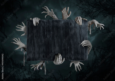 Mummy's hands wrapped in a bandage rises through the wooden boards. Background with copy space. The hand of the risen dead mummy monster for Halloween horror concept.