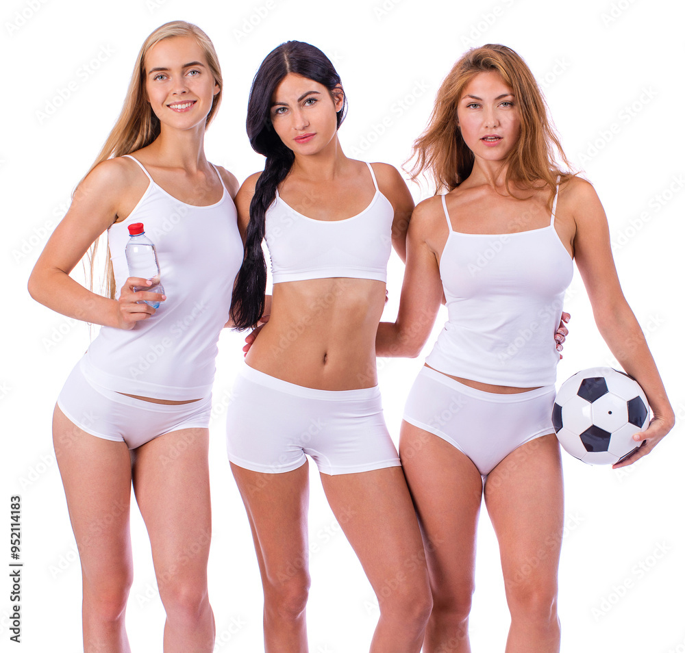 Fitness women. Three young beautiful girlfriends in white sportswear