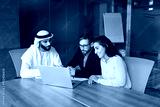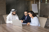 Young Arabic business professional man in white clothes showing real estate online presentation on laptop to European couple, selling property for investment, meeting with customers at office table