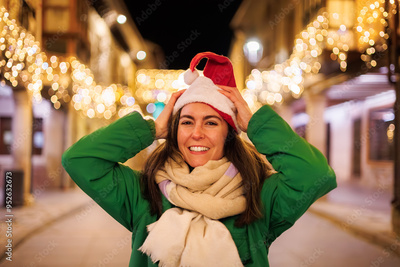 Cheerful and cute latin woman with christmas hat smiling to the camera on Christmas Eve.