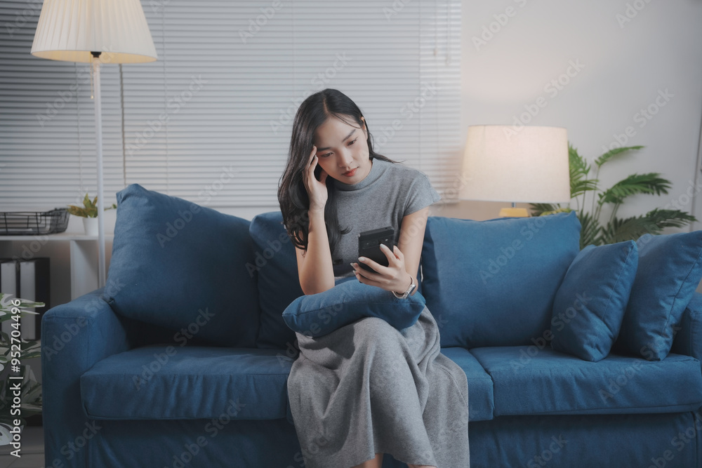Young asian woman sitting on a sofa is feeling stressed while using a smartphone at home