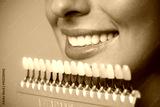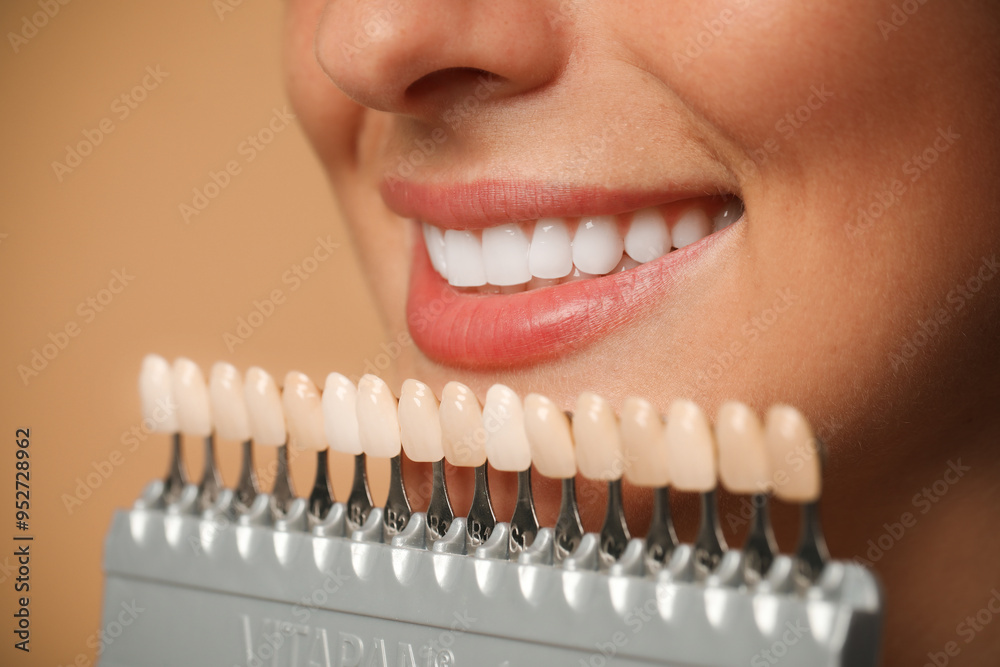 Smiling woman with teeth color samples on beige background, closeup. Dental veneers