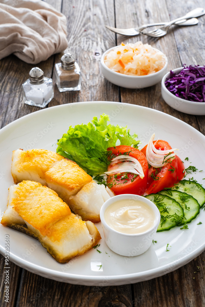 Fried halibut steaks and fresh vegetables served on white plate on wooden table