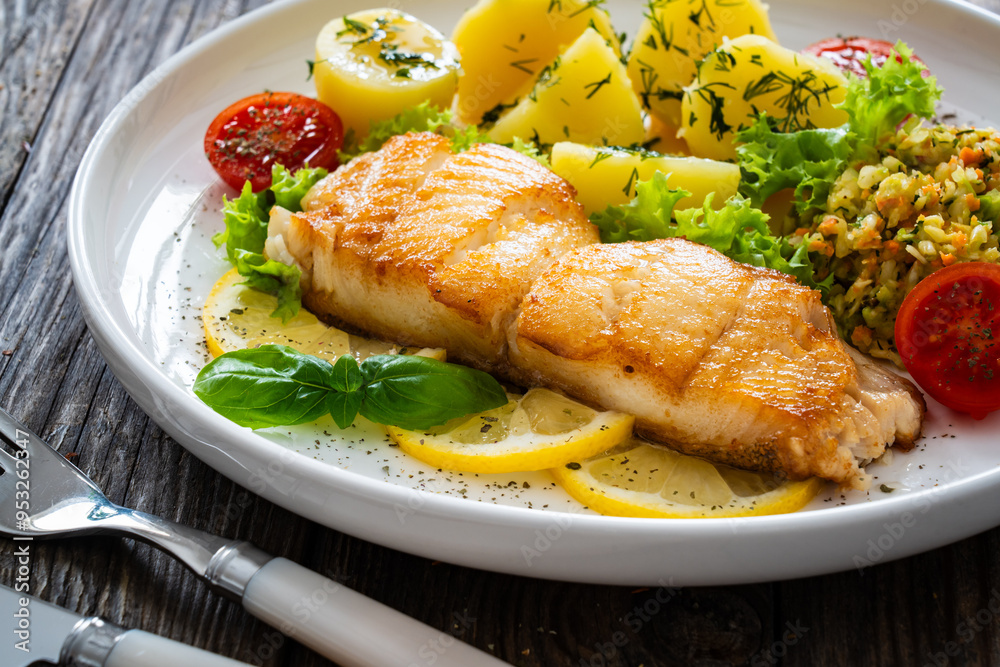 Fried codfish loin boiled potatoes and cabbage salad served on white plate on wooden table