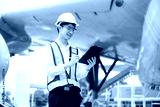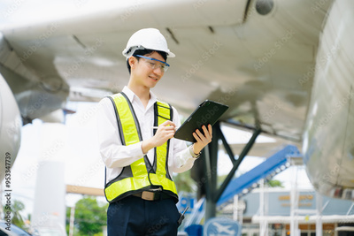 Male aviation engineer in safety gear inspecting an airplane engine, embodying professionalism