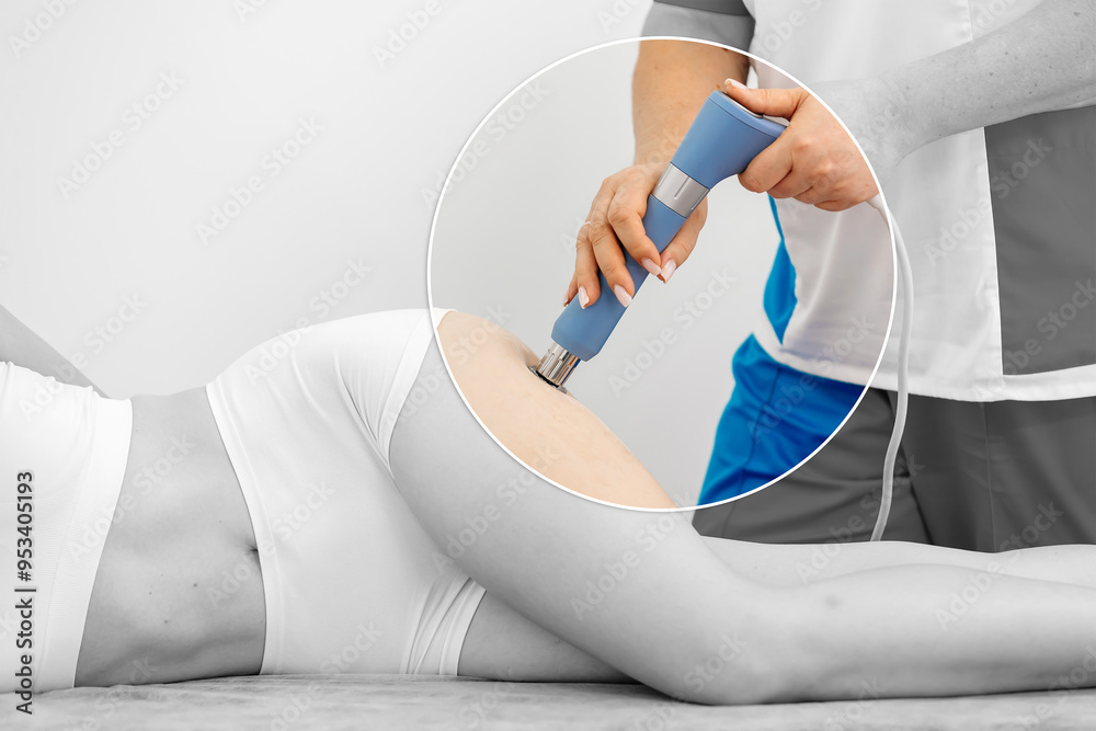 Shockwave Therapy (ESWT) on a young woman’s legs. A non-invasive treatment that promotes healing and reduces pain. Ideal for showcasing modern physiotherapy techniques and recovery methods.