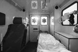 Interior of modern ambulance car of emergency medical service. Themes rescue, urgency and health care..