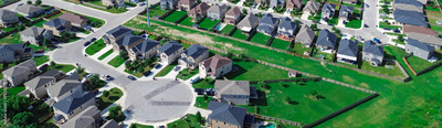 Panorama aerial view new constructions aera in New Braunfels suburbs San Antonio, row of two-story houses in urban sprawl encroachment vacant land for growth, large backyard, cul-de-sac street