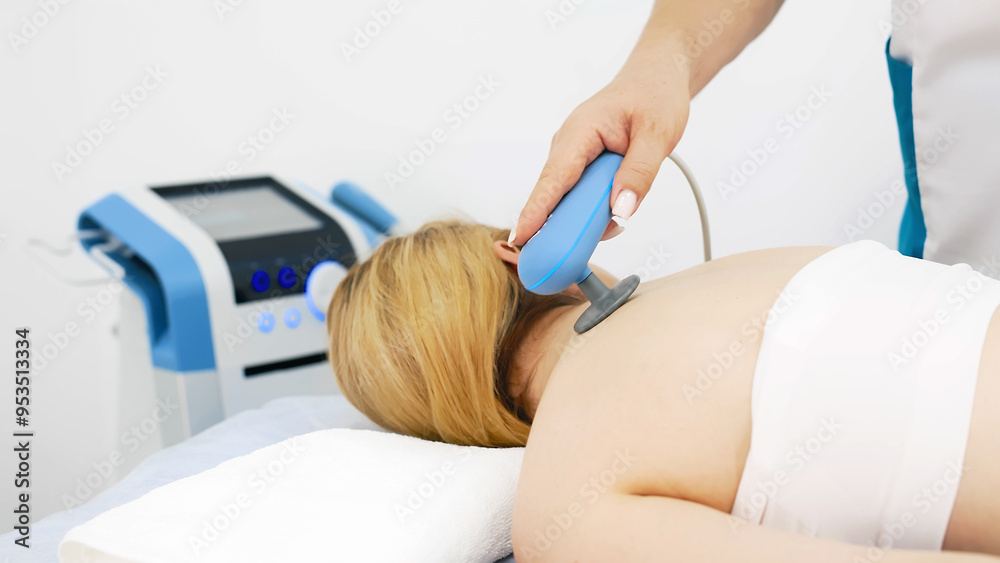 Young woman receiving electromagnetic therapy in a modern clinic. The treatment speeds up tissue healing, eases pain, and promotes muscle recovery, contributing to overall wellness.