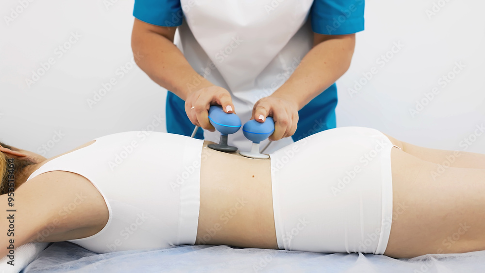 Young woman receiving electromagnetic therapy in a modern clinic. The treatment speeds up tissue healing, eases pain, and promotes muscle recovery, contributing to overall wellness.
