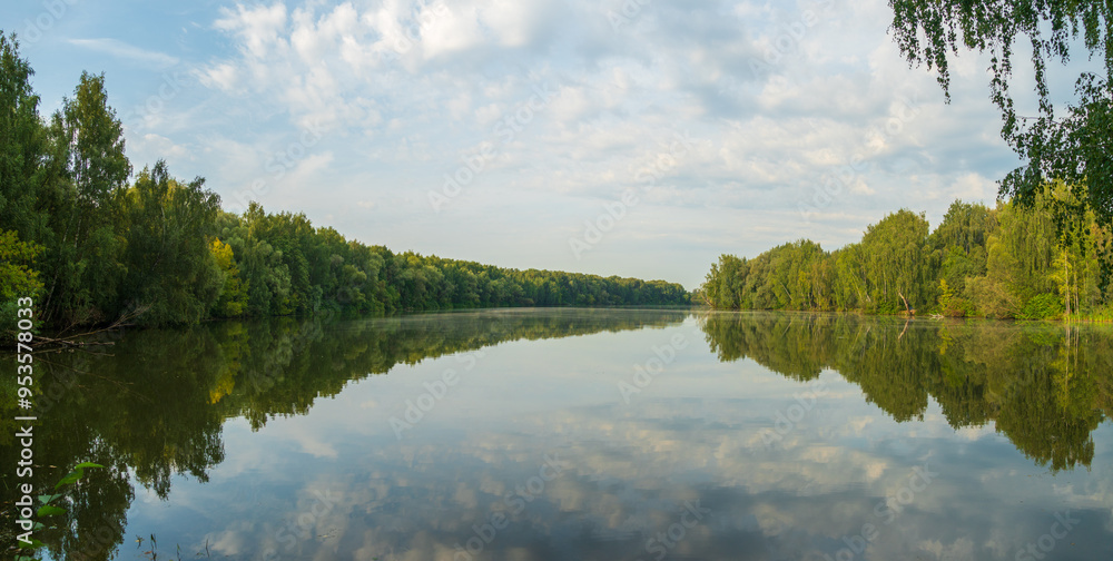 Reflection of trees in the lake. Panoramic view of the banks of the river bay