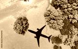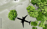 Shadow airplane flying above mangrove forest. Use of biofuel for sustainable aviation. Sustainable transportation. Eco-friendly flight. Aviation sustainability. Reducing aviation's carbon footprint.