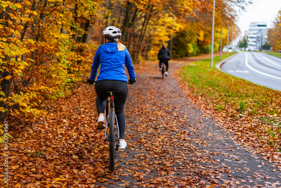 Middle aged woman wearing blue sporty jacket, black cycling pants and white bike helmet riding bicycle on bike path in city in autumn scenery. Back view.