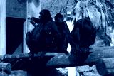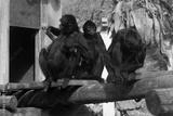 Group of three black spider monkeys sitting on a tree branch in the lisbon zoo