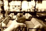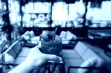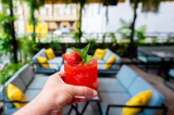 A close-up of a hand holding a glass with a red strawberry cocktail, garnished with fresh mint and strawberry, in an outdoor cafe setting. Perfect for summer refreshment and social media posts.