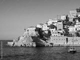 Hydra island port and sea view in sunset colors. Saronic Gulf, Greece