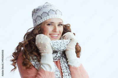smiling trendy 40 years old woman on white wrapping up in scarf