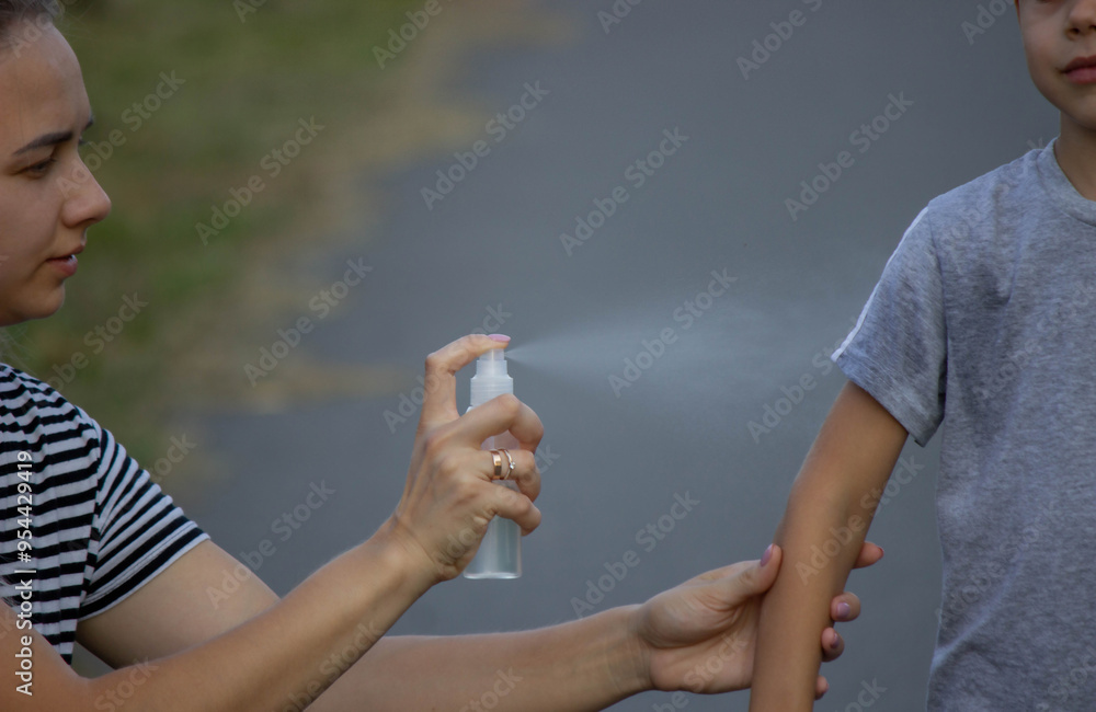 woman applies insect repellent to her son's hand in the park, close-up. Prevention of bites
