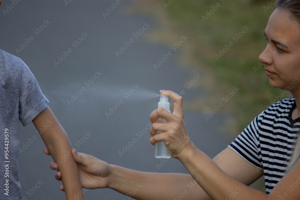woman applies insect repellent to her son's hand in the park, close-up. Prevention of bites