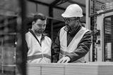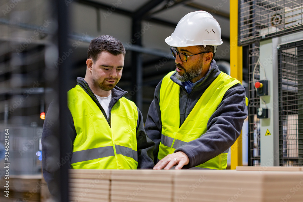 Young man with Down syndrome working in modern factory, colleague teaching him about his job, showing process. Concept of workers with disabilities, support in workplace.
