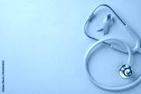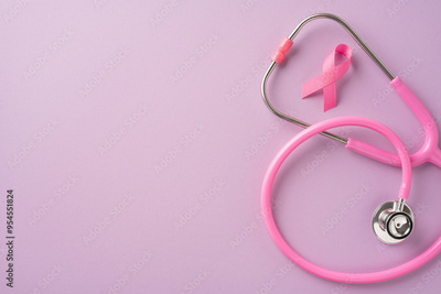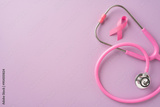 Pink stethoscope and awareness ribbon on a pastel background symbolizing breast cancer awareness and healthcare support
