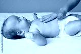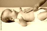 Unknown woman gently massaging her healthy newborn tiny Caucasian babywearing just diaper resting on his back on white sheet mother soothing his tummy to ward off colic
