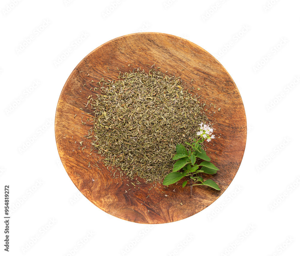 Dry thyme isolated, dried marjoram, oregano pile, ground crushed thyme seasoning, thyme leaves