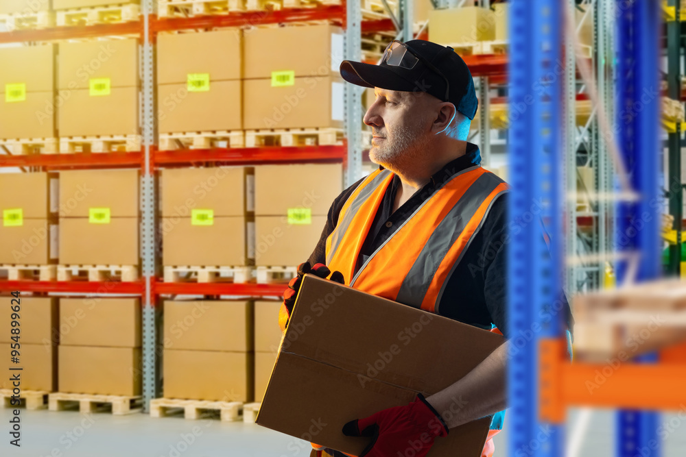 Man warehouse worker. Fulfillment center specialist. Man with box stands inside warehouse. Storekeeper guy smiles. Employee of warehouse company among racks of pallets. Storage manager career